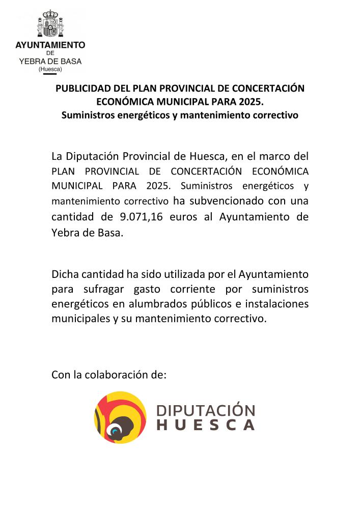 La Diputación Provincial de Huesca, en el marco del PLAN PROVINCIAL DE CONCERTACIÓN ECONÓMICA MUNICIPAL PARA 2025. Suministros energéticos y mantenimiento correctivo ha subvencionado con una cantidad de 9.071,16 euros al Ayuntamiento de Yebra de Basa.